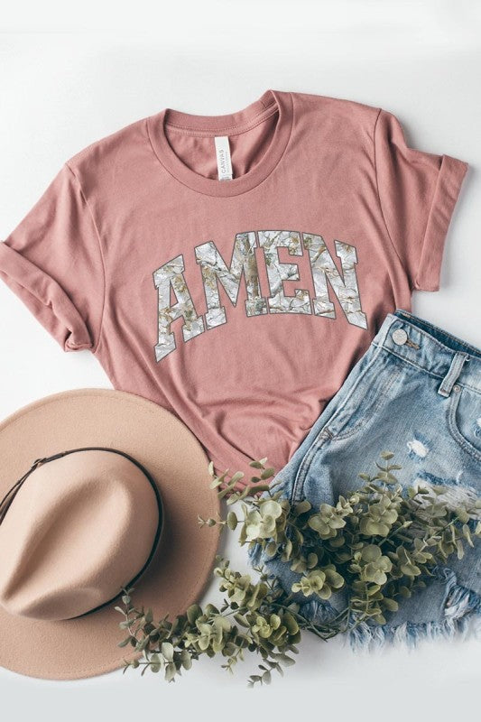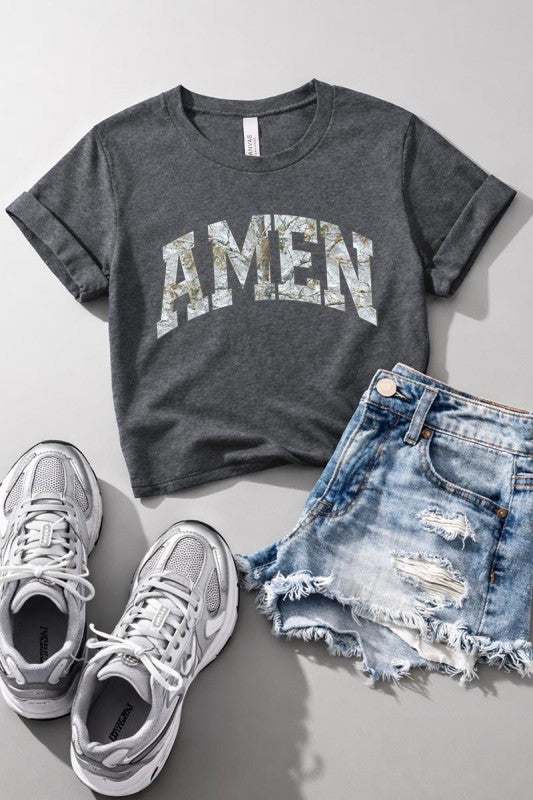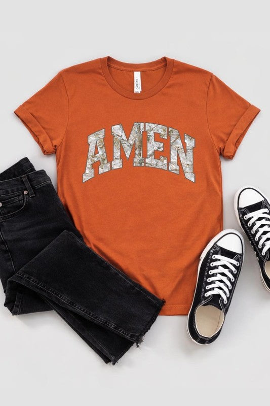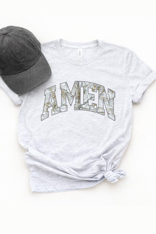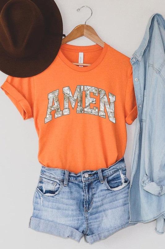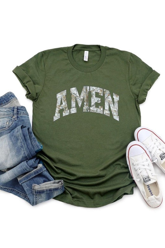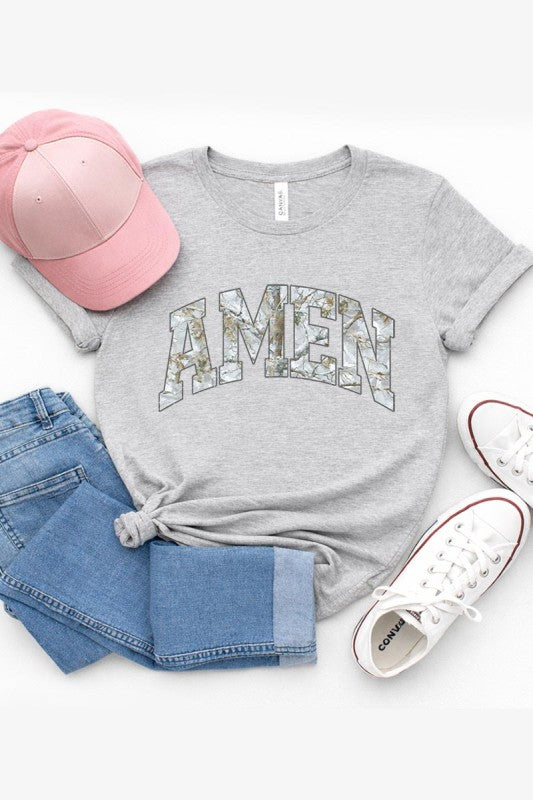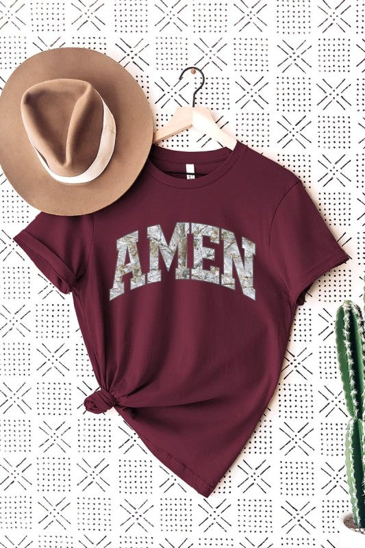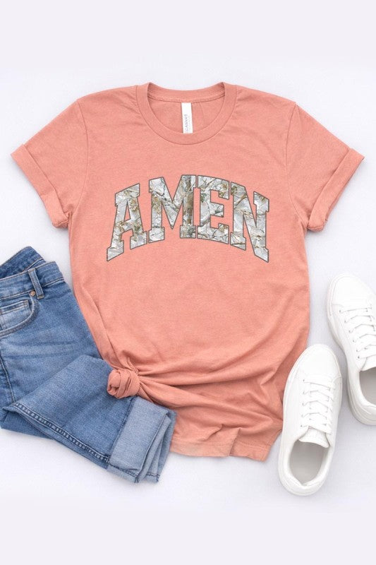 amen graphic tee, camo graphic shirt, wood texture tee, faith graphic top, christian graphic shirt, rustic graphic tee, western boutique apparel, outdoor style shirt, unisex graphic tee