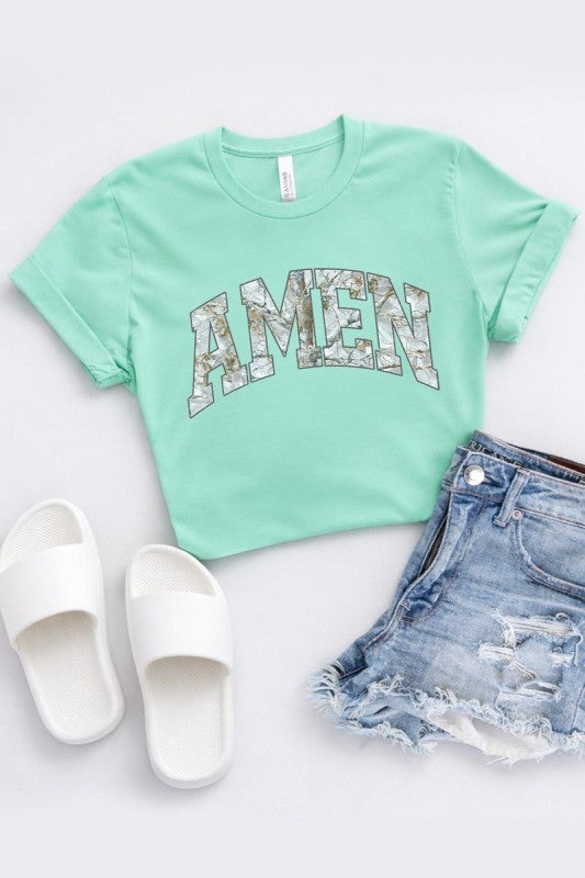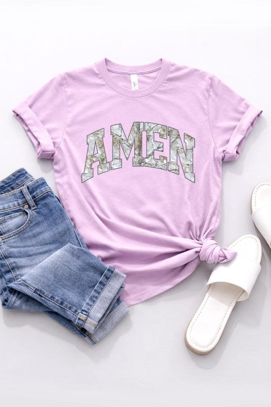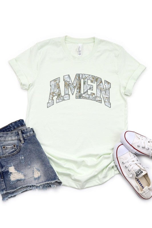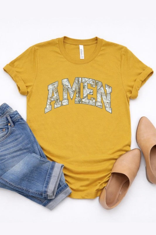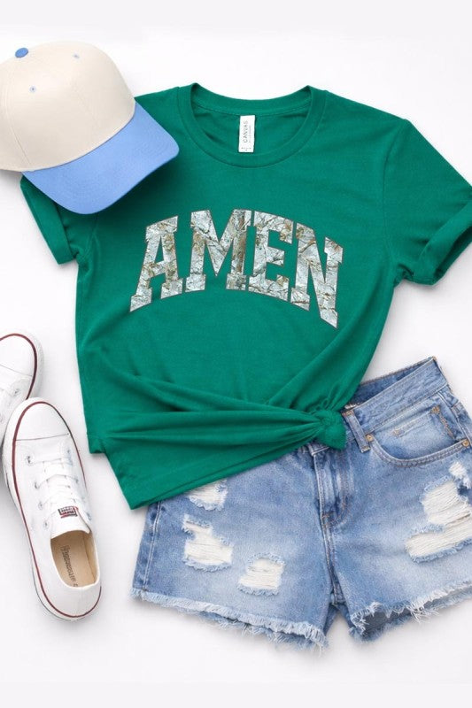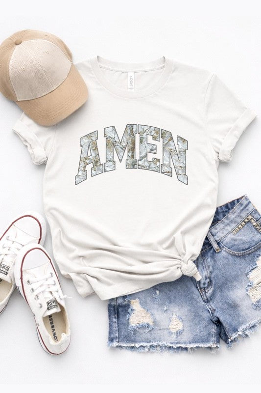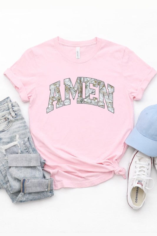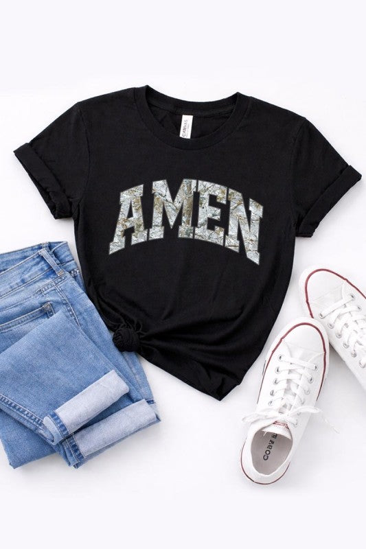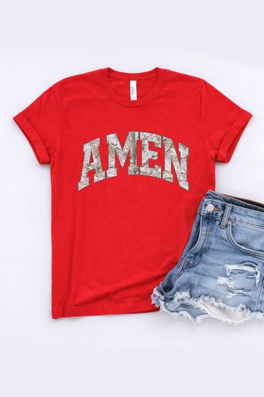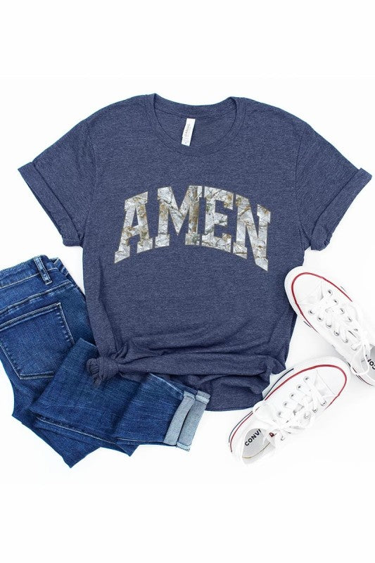 amen graphic tee, camo graphic shirt, wood texture tee, faith graphic top, christian graphic shirt, rustic graphic tee, western boutique apparel, outdoor style shirt, unisex graphic tee
