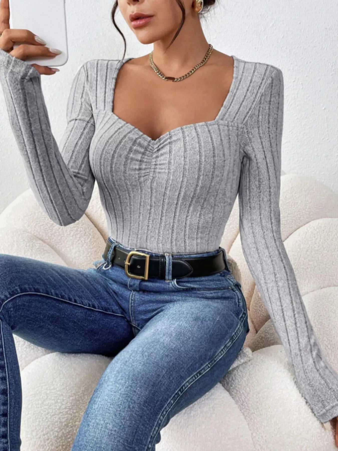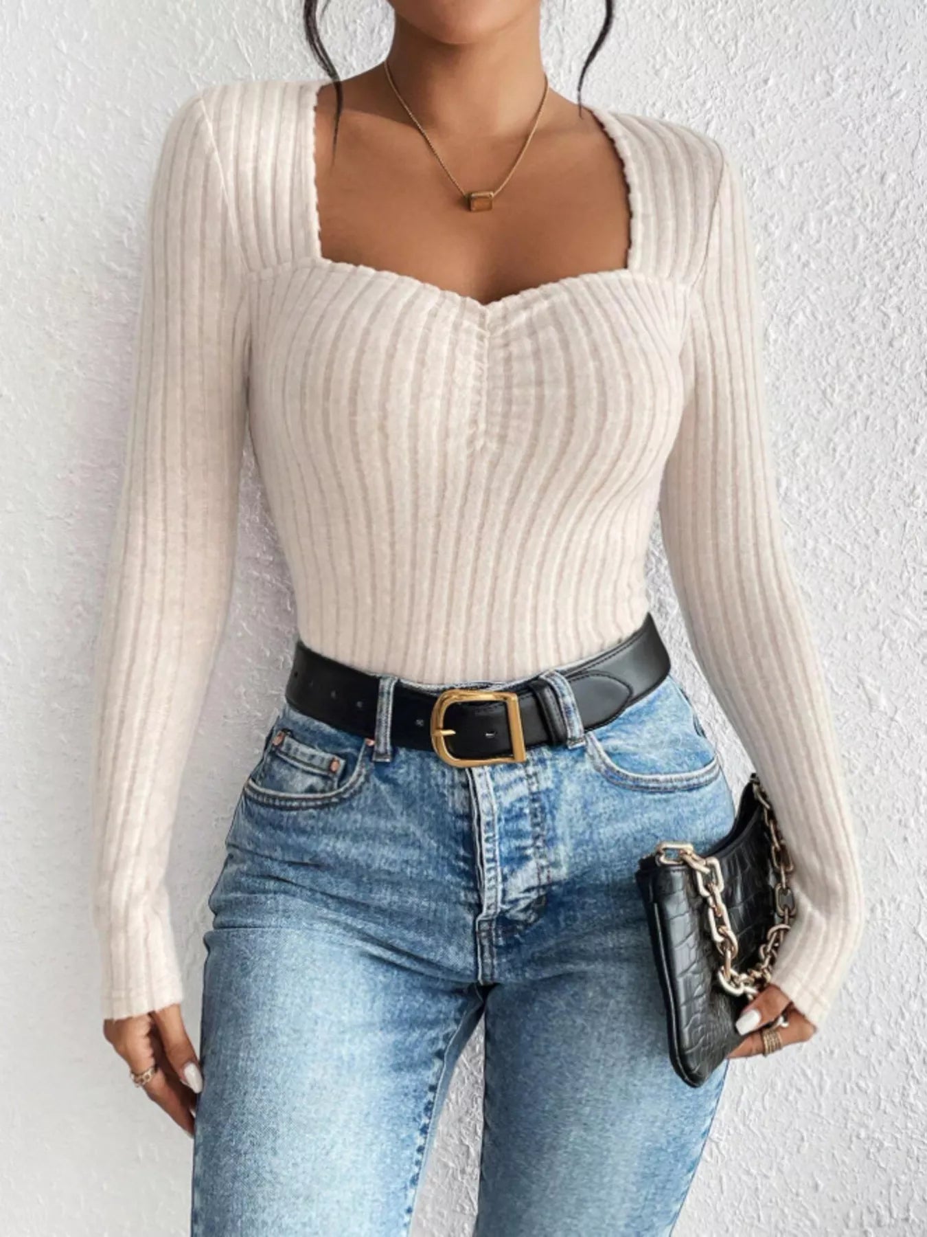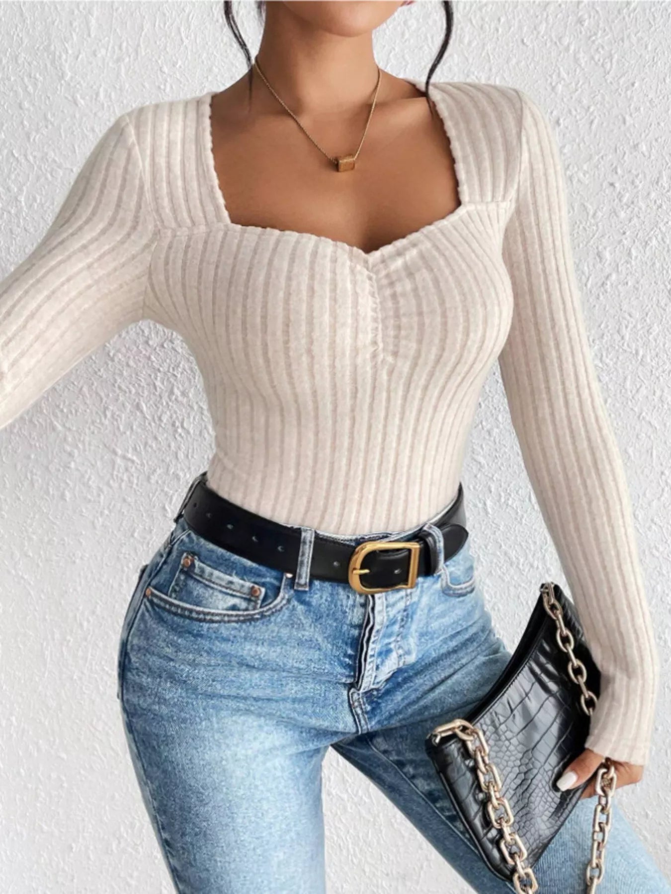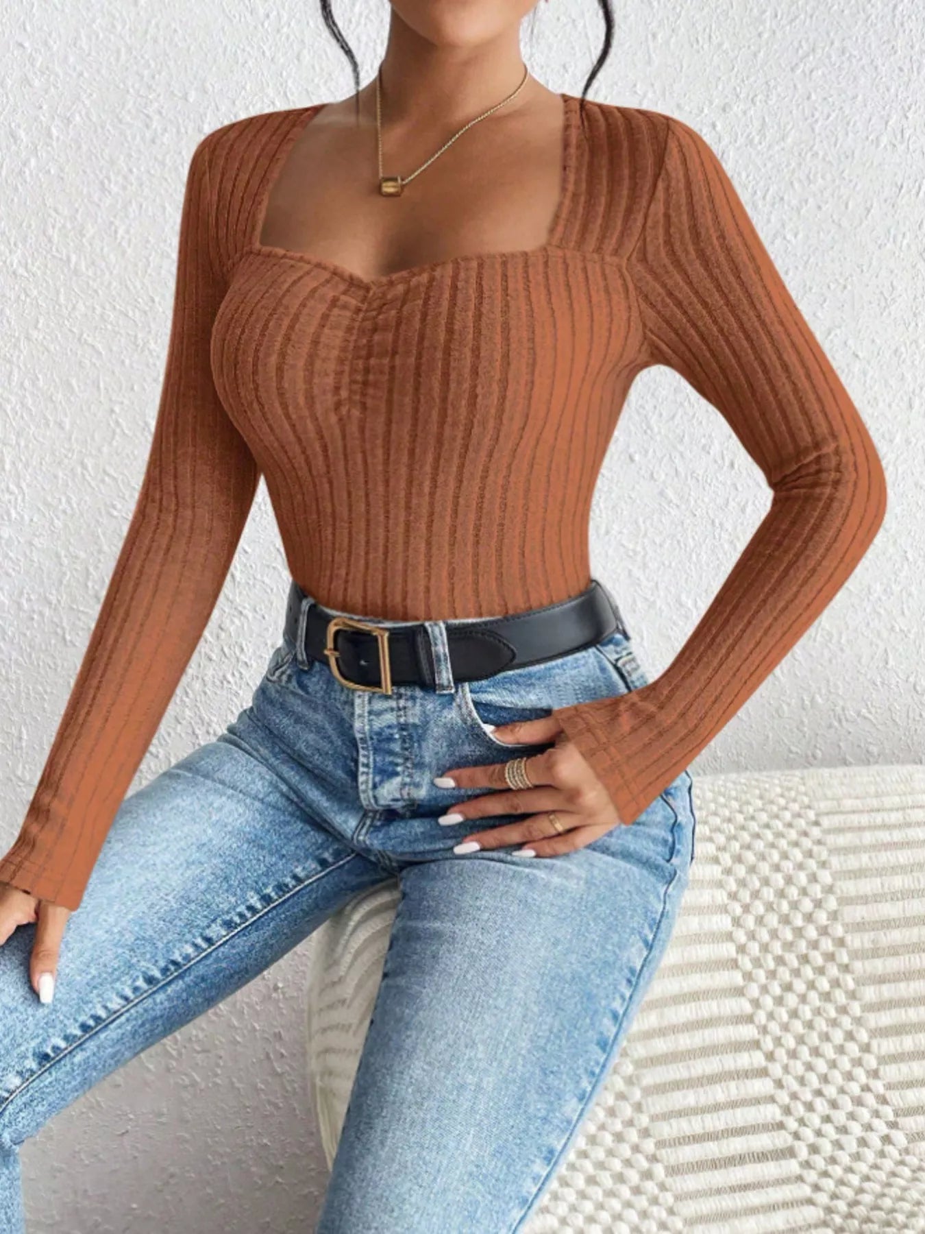 Ribbed Sweetheart Neck Long Sleeve T-Shirt